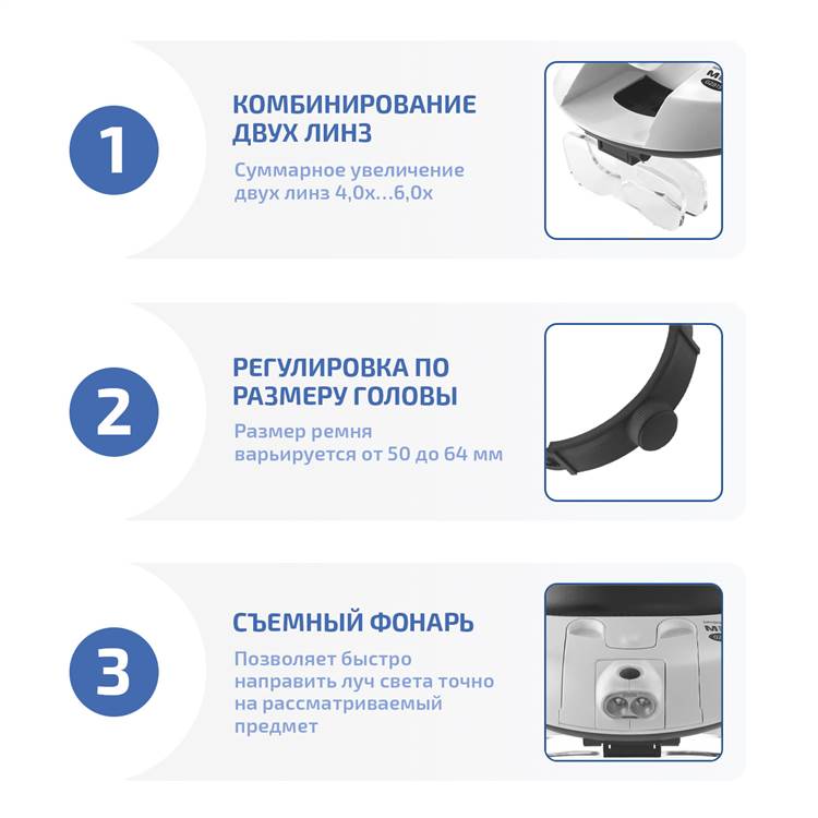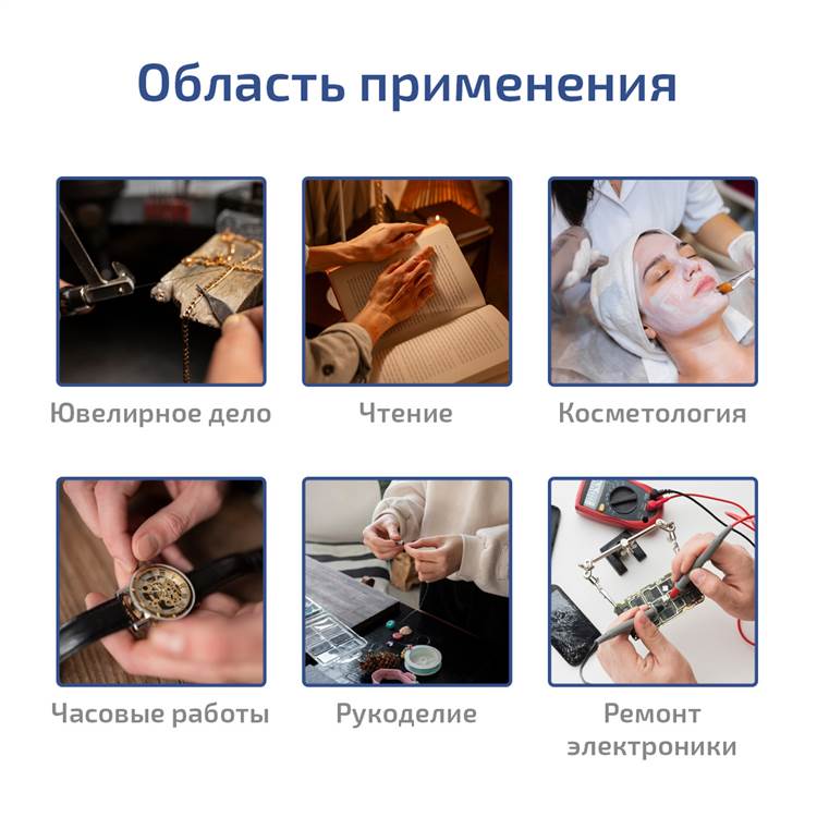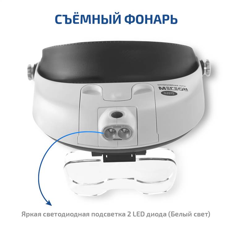 Удобный ремешок позволяет правильно настроить положение лупы и надёжно закрепить её на голове. Дополнительно предусмотрены наклон корпуса относительно положения ремня и изменение угла линзодержателя. Всё это стало возможно благодаря продуманной конструкции и узлов сочленения. Благодаря наличию светодиодной подсветки, изделие найдёт применение в условиях недостаточной видимости или в полном отсутствии всех видов освещения. Эргономичный дизайн, компактные габаритные размеры и небольшой вес сделают эксплуатацию изделия простой и удобной. Прибор может одинаково использоваться в профессиональной сфере, любительской, обучении.
