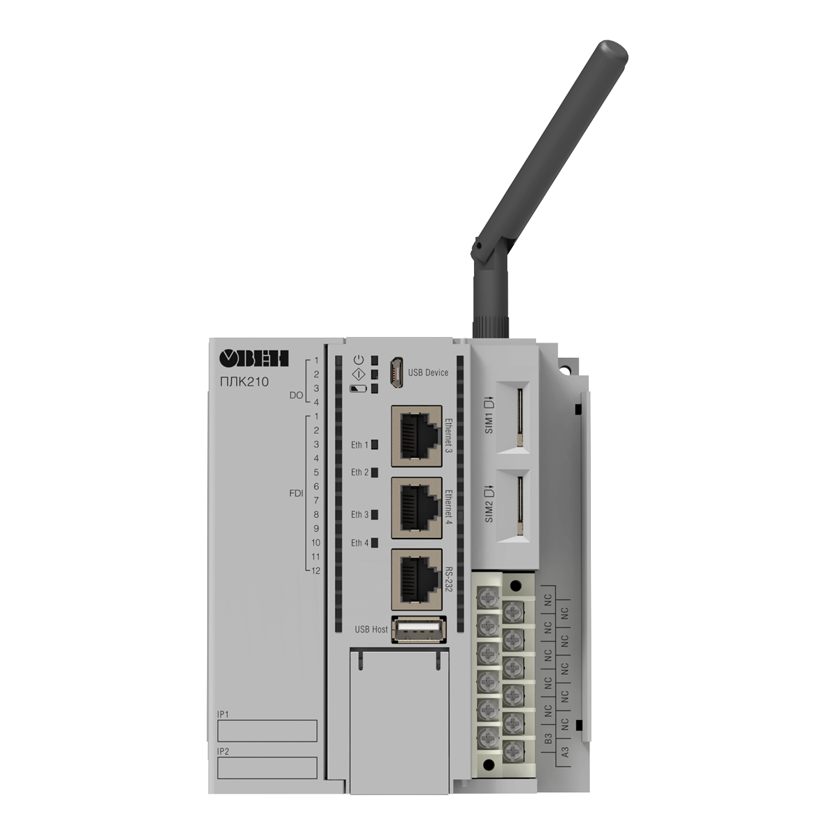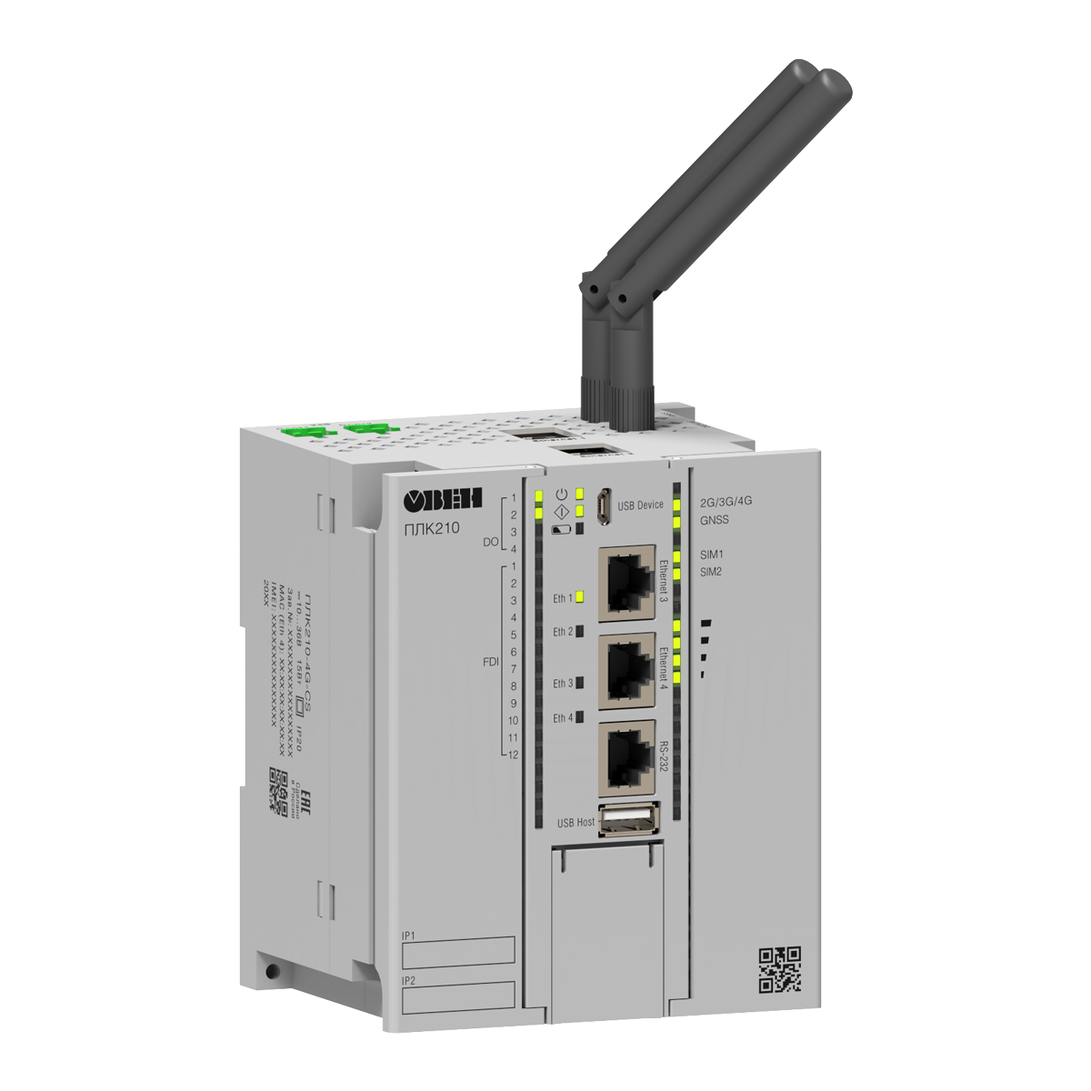 ОВЕН ПЛК210-4G – высокопроизводительный моноблочный контроллер со встроенным LTE-модемом, модулем GNSS (GPS/ГЛОНАСС) и тремя RS-485.